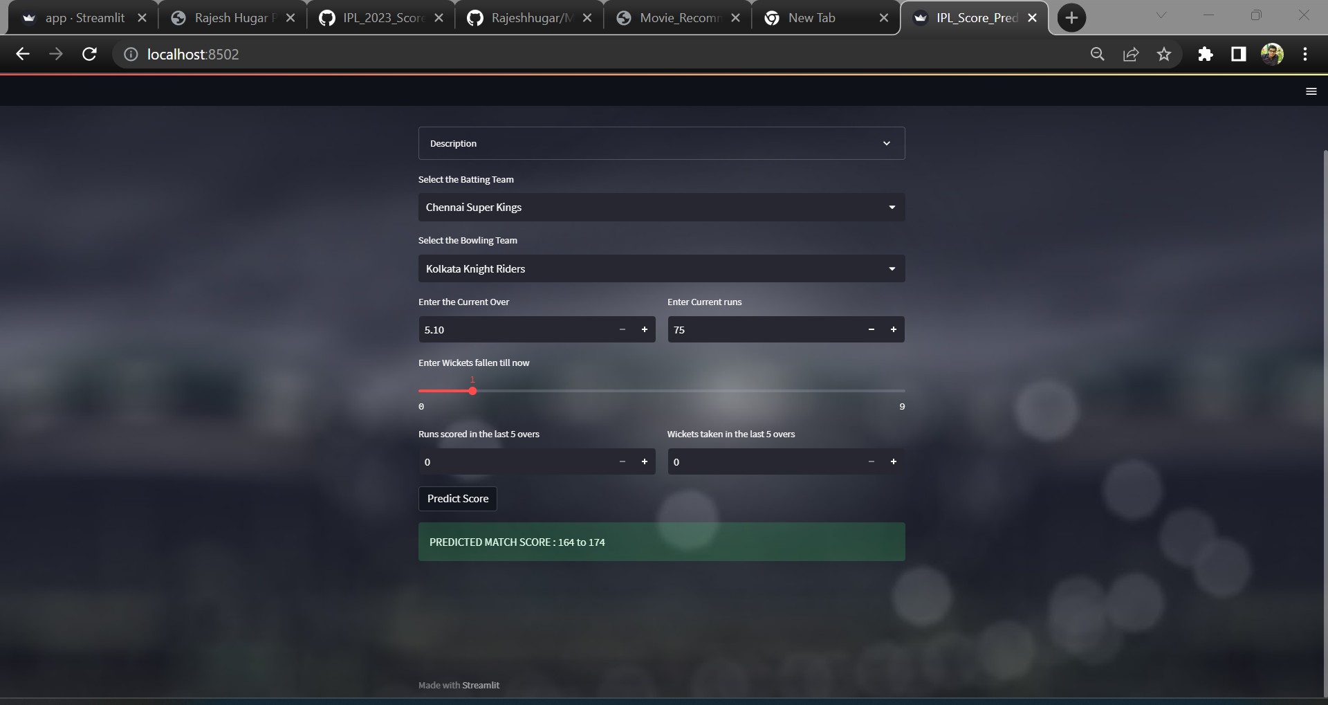 The IPL score predictor is a machine learning project that utilizes historical IPL data to predict the scores of IPL matches. Trained using Random forest machine learning algorithm, and its performance is evaluated using metrics such as mean squared error and R-squared. The project demonstrates the potential of machine learning in sports analytics and provides valuable insights into the performance of IPL teams and players.